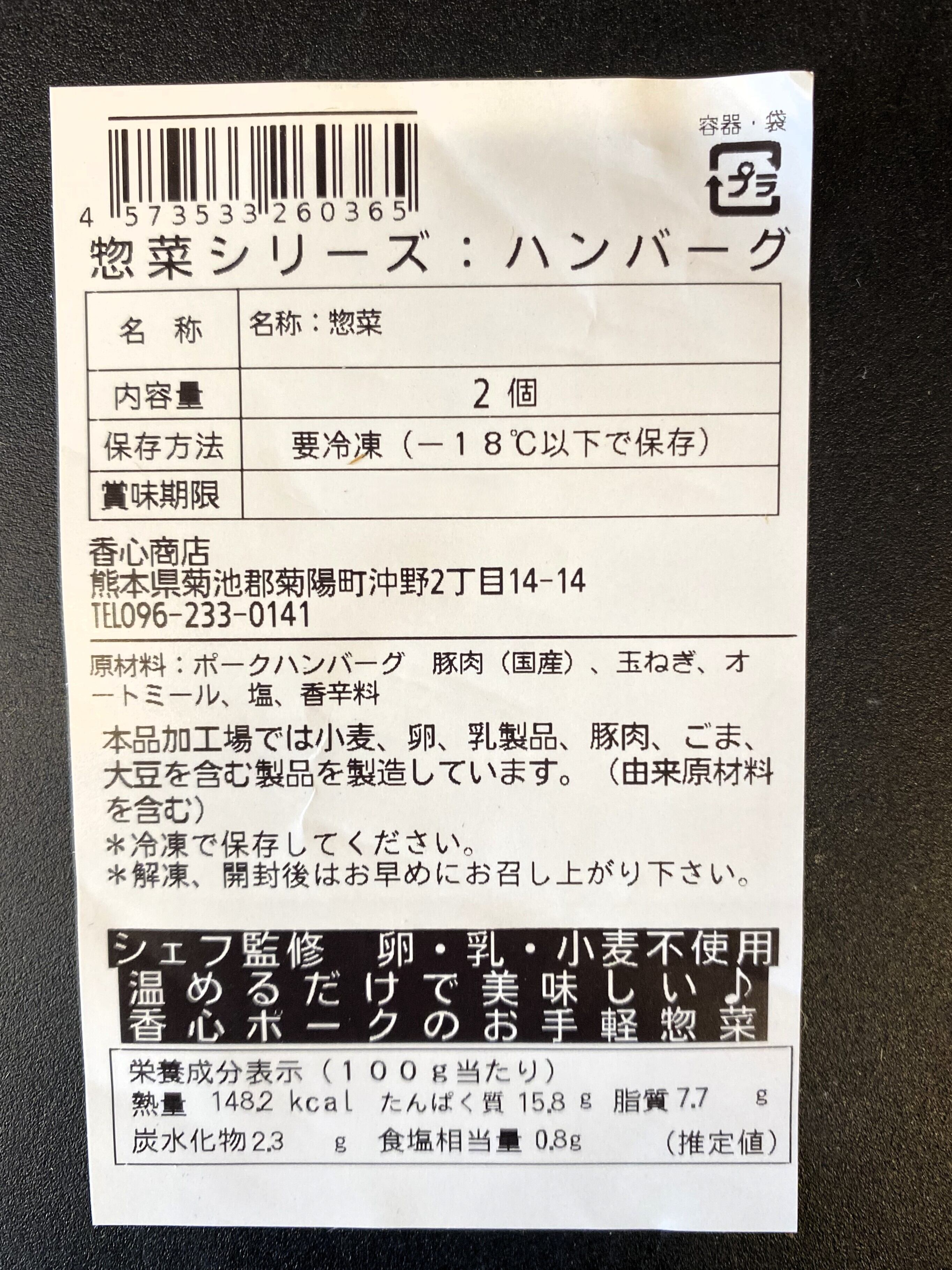 原材料:豚肉(熊本県産)、玉ねぎ、オートミール、塩、香辛料